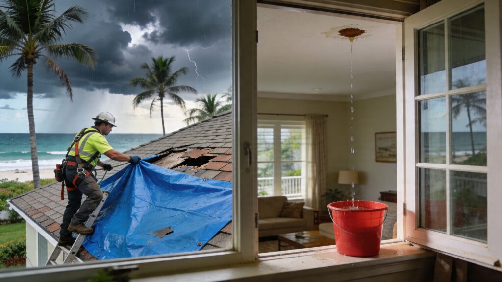 A tarp can buy time. A badly installed tarp can trap water, tear loose in wind, or damage the roof covering more than the original leak. In Fort Lauderdale, I see this after tropical weather all the time. Someone nails plastic into the wrong area, water gets driven underneath, and now the repair includes deck damage and interior staining that might have been avoided.
